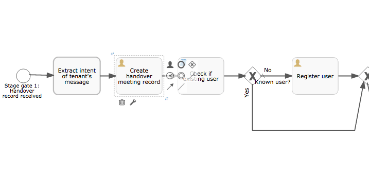 After that we see the user task “Create handover meeting record”. This might involve a paper record or updating another system, or both. In the first instance, we are not trying to radically transform the business process so we simply provide a task for a person to do what is needed. Once the process has been running for a while, we will analyse its use and identify bottlenecks or mistakes that can benefit automation. This way, we build incrementally and are data-driven, rather than develop solutions speculatively and potentially waste time and effort.