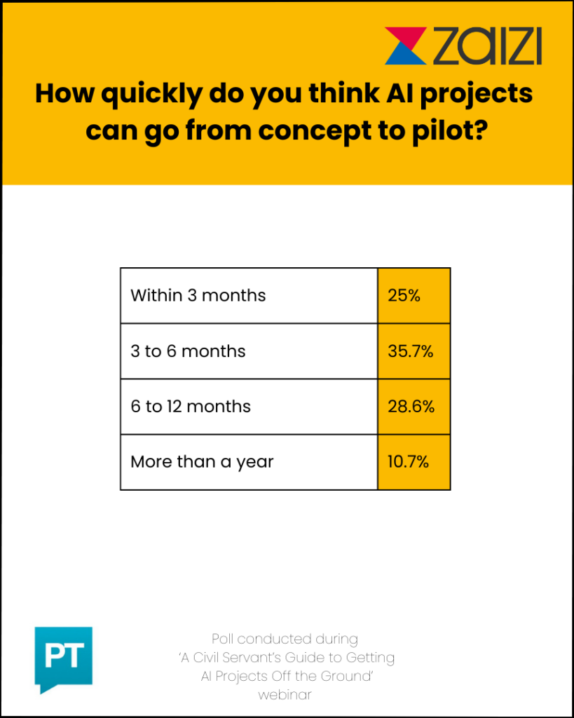 Border Force’s AI project showed that well-executed initiatives can quickly deliver value — a view shared by 60% of the attendees who felt AI projects can go from concept to pilot within half a year.